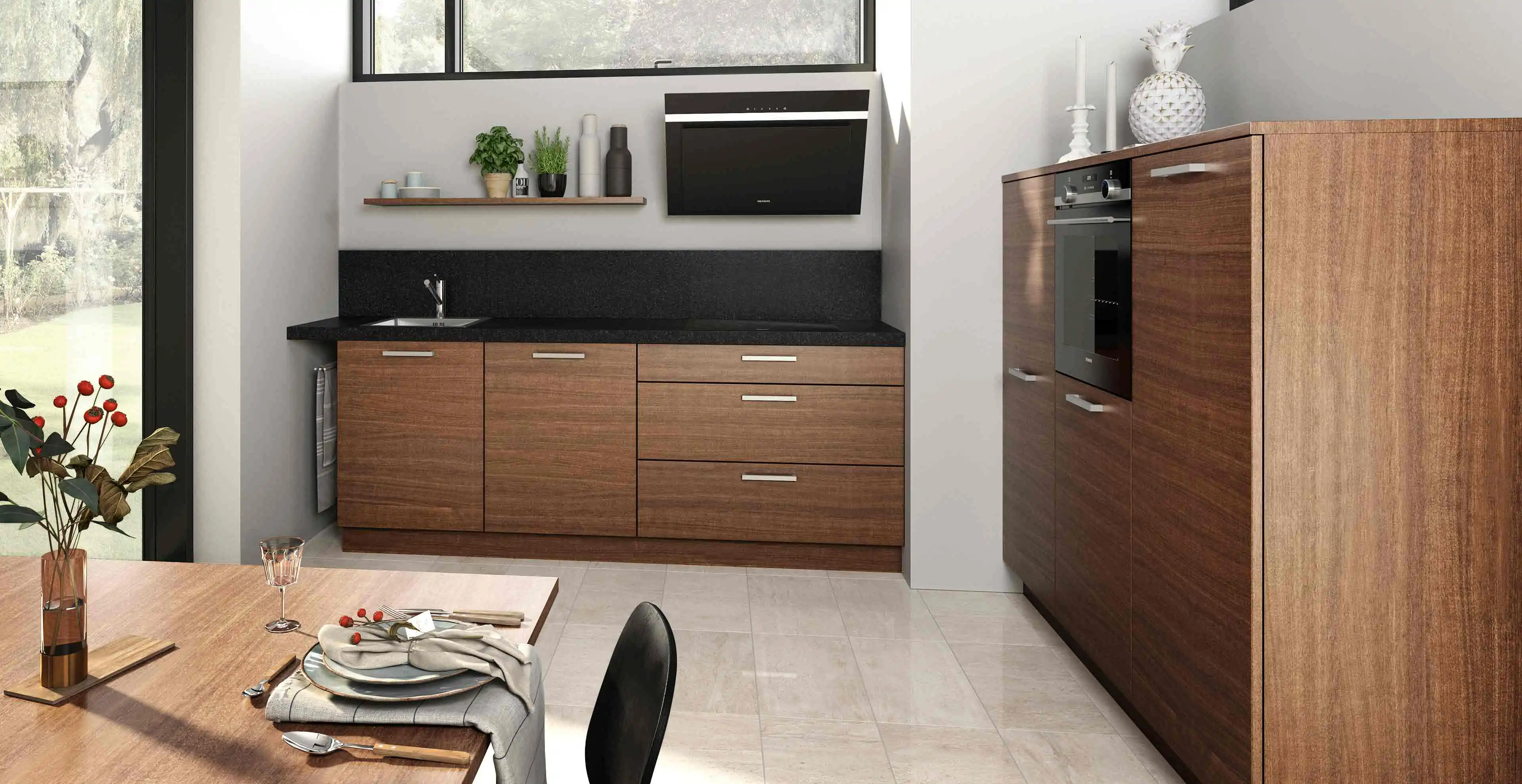 Das Highlight: Der Korpus und die Fronten versprühen durch das moderne Holzdesign ihren ganz eigenen Charme und sorgen dadurch für eine gemütliche Atmosphäre in der Küche.