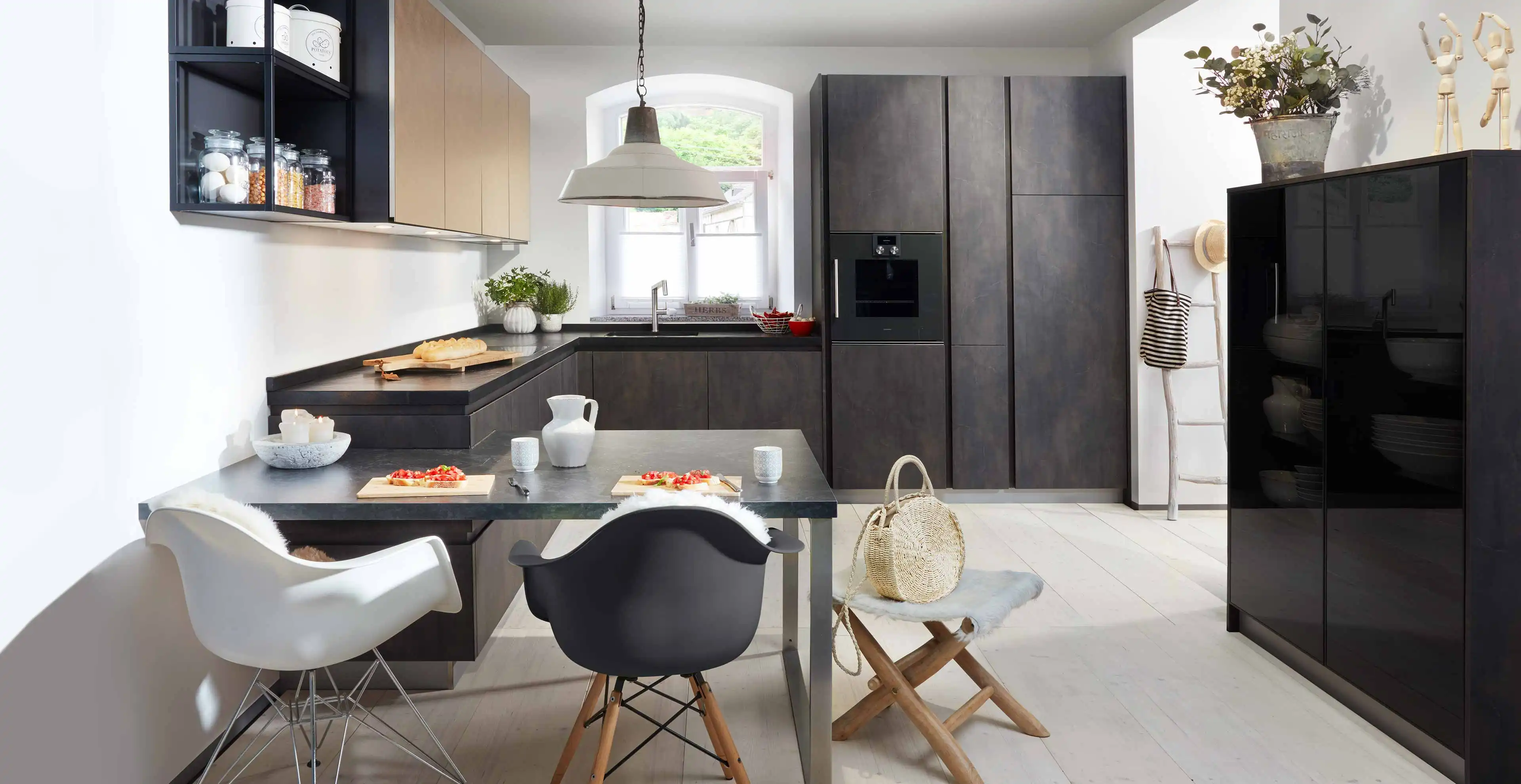 Das dänische Wort „hygge“ ist zur Zeit in aller Munde und bringt auf den Punkt, was viele Küchenliebhaberinnen und -liebhaber am skandinavischen Design so sehr schätzen: Gemütlichkeit, einen Ort für unser alltägliches Miteinander und die Kunst, es sich schön zu machen. Dazu gehören natürlich wertige Materialien wie Holz, Metall, Glas oder Stein, die die skandinavische Bodenständigkeit perfekt widerspiegeln. Die skandinavische Lieblingsküche sieht mit ihren schicken grifflosen Fronten in dunkelmattem Stahl nicht nur gut aus, sondern ist auch praktisch und funktional zugleich. So ist die hochwertige Quarzarbeitsplatte ein echter Blickfang in der Küche und zudem besonders hygienisch und pflegeleicht - einfach unkompliziert. Denn sie besitzt eine geschlossene Oberfläche, so dass sich keine Fette und Bakterien in der Arbeitsplatte festsetzen können. Außerdem ist sie schnittfest und unempfindlich gegen Flecken. Ein weiteres Highlight: die untergebaute Spüle, die nicht mit Ihrer Optik überzeugt, sondern durch die Einbauweise dezent in den Hintergrund rückt. Außerdem gibt es keine Rillen oder Kanten, in denen sich Staub oder Essensreste festsetzen können, somit ist sie spielend leicht zu reinigen.