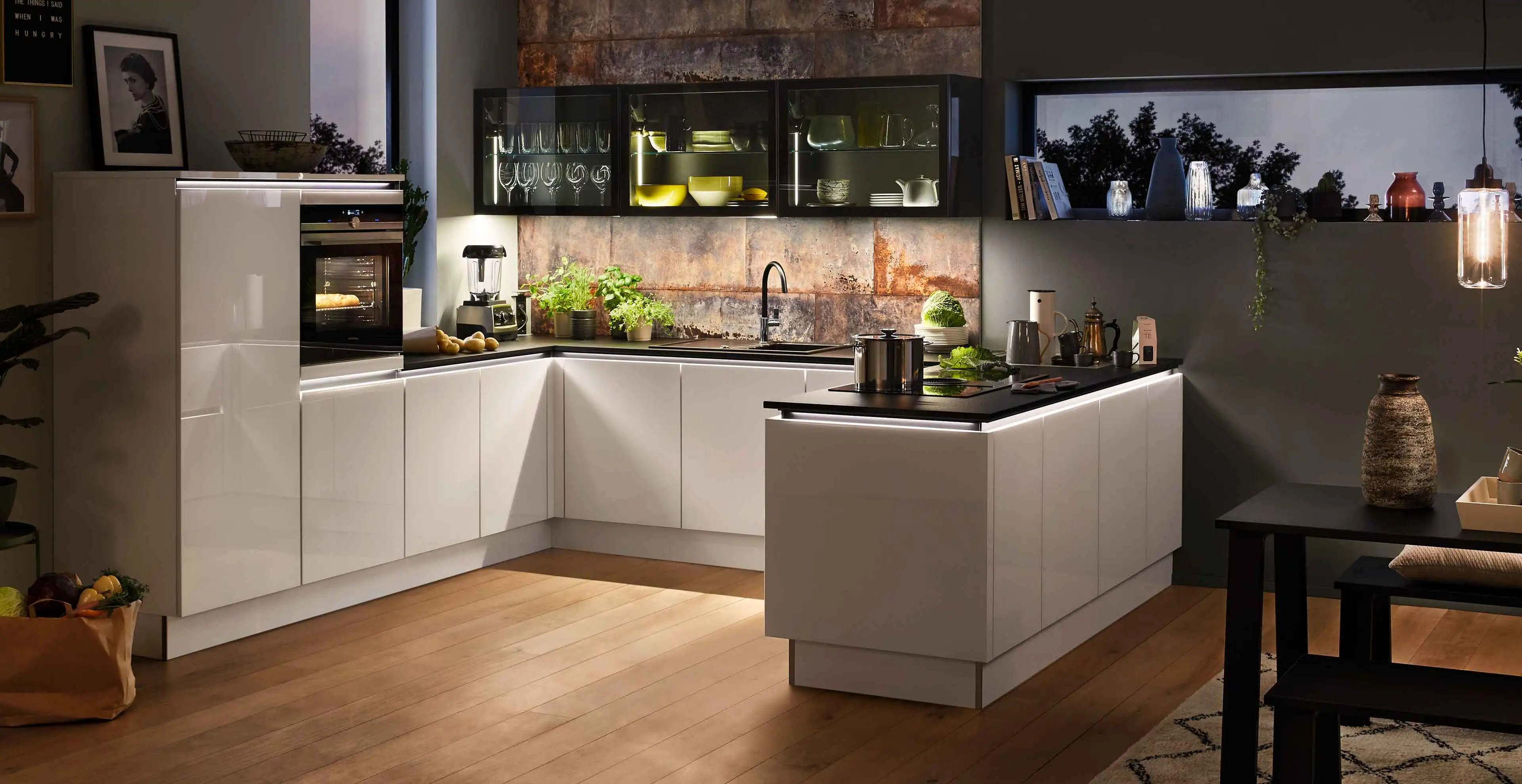 Die offenen Hängeschränke mit Glastüren setzen das Geschirr perfekt in Szene und die integrierte Hängeschrankbeleuchtung sorgt für stimmungsvolle Lichtblicke!