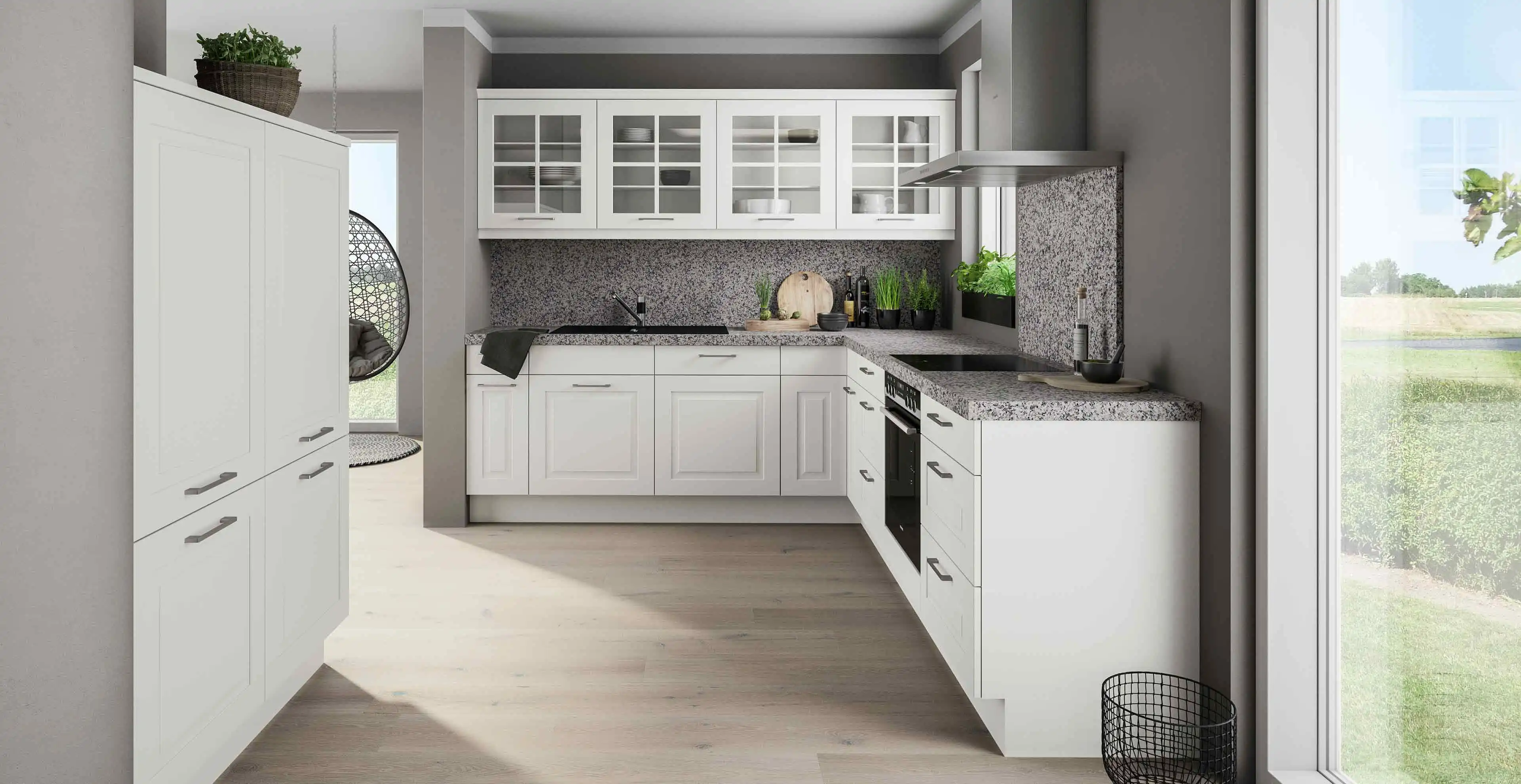 Diese charmante L-Küche lädt zum Wohlfühlen und setzt auf die Detailverliebtheit. Neben klassischen Kassettenfront erwarten Sie auch Oberschränke mit Glaseinsätze, die Ihr Geschirr perfekt in Szene setzen. Schlichte Edelstahlgriffen ergänzen diese Landhausküche und passen perfekt zur Granitarbeitsplatte Bianco Sardo. Auch das Kocherlebnis wird durch beste und modernste Technik gestützt. Sie haben die Wahl und können diese Küche zu Ihrer Traumküche machen.