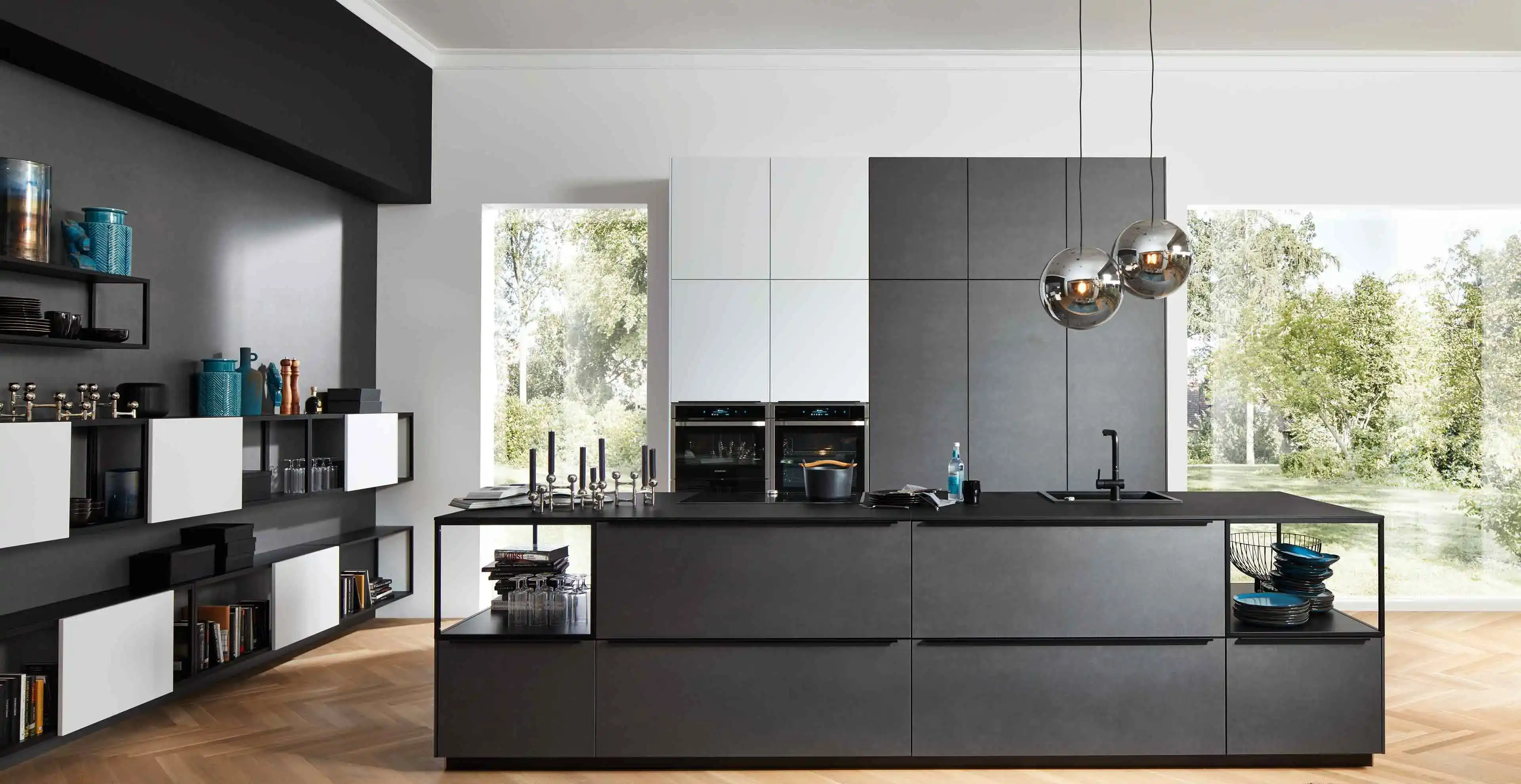 Die magnetische Oberfläche der Küchenfronten "Ferro Blaustahl" ist nicht nur praktisch, sie zieht auch alle Blicke auf sich. Außerdem weist der nahtlose Übergang, der Küchenmöbel in den Wohn- und Essbereich, auf eine durchdachte Wohnlösung hin. Ein weiteres Highlight sind die integrierten Regale, die der Insel das gewisse Etwas verleihen.