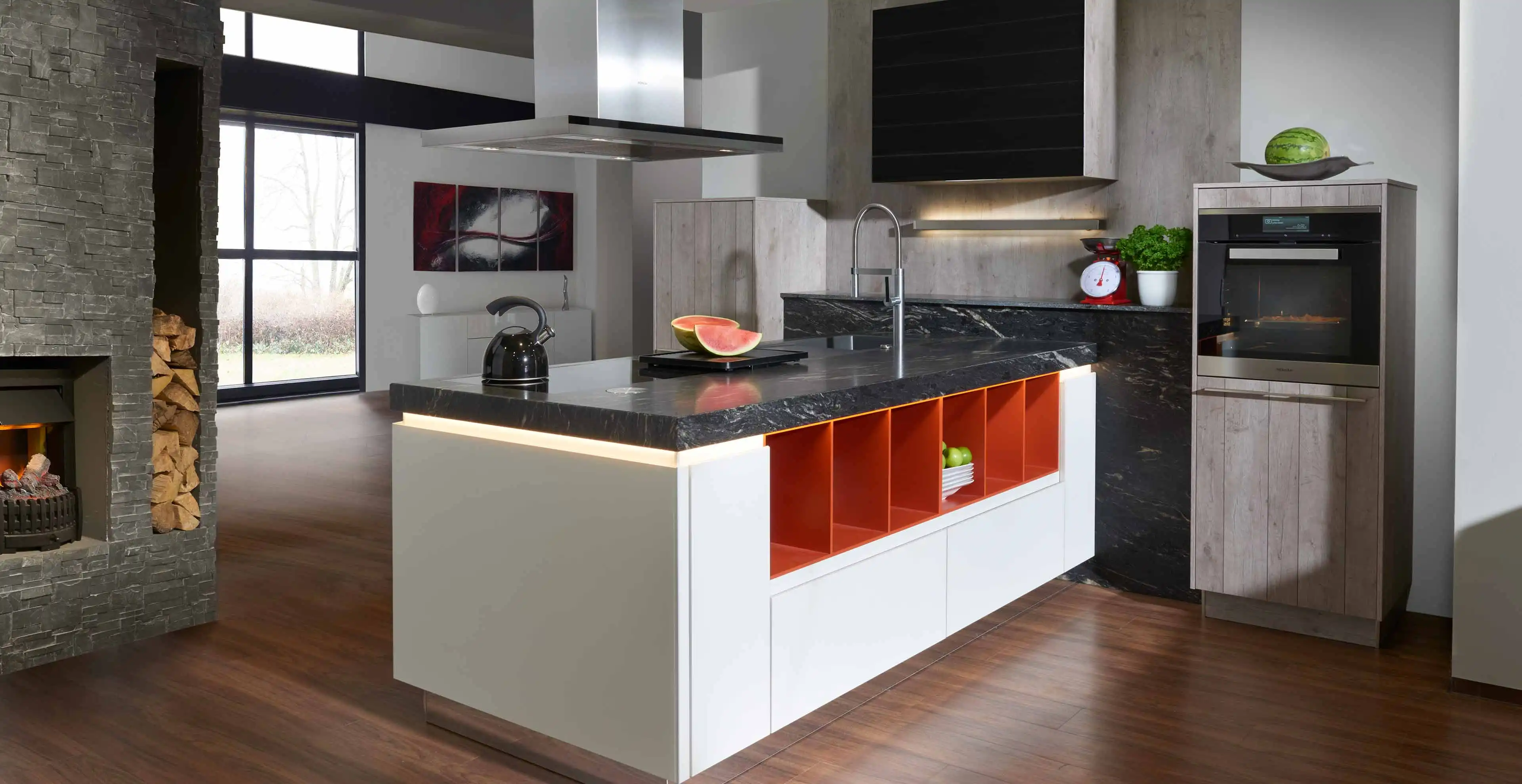 Der schwarze Wandschrank mit elektrisch öffnender Glasjalousie, der hochmoderne freihängende Dunstabzug und Fronten in Holzoptik sorgen in dieser klassischen Inselküche für zusätzliche Spannung und optische Reize.
