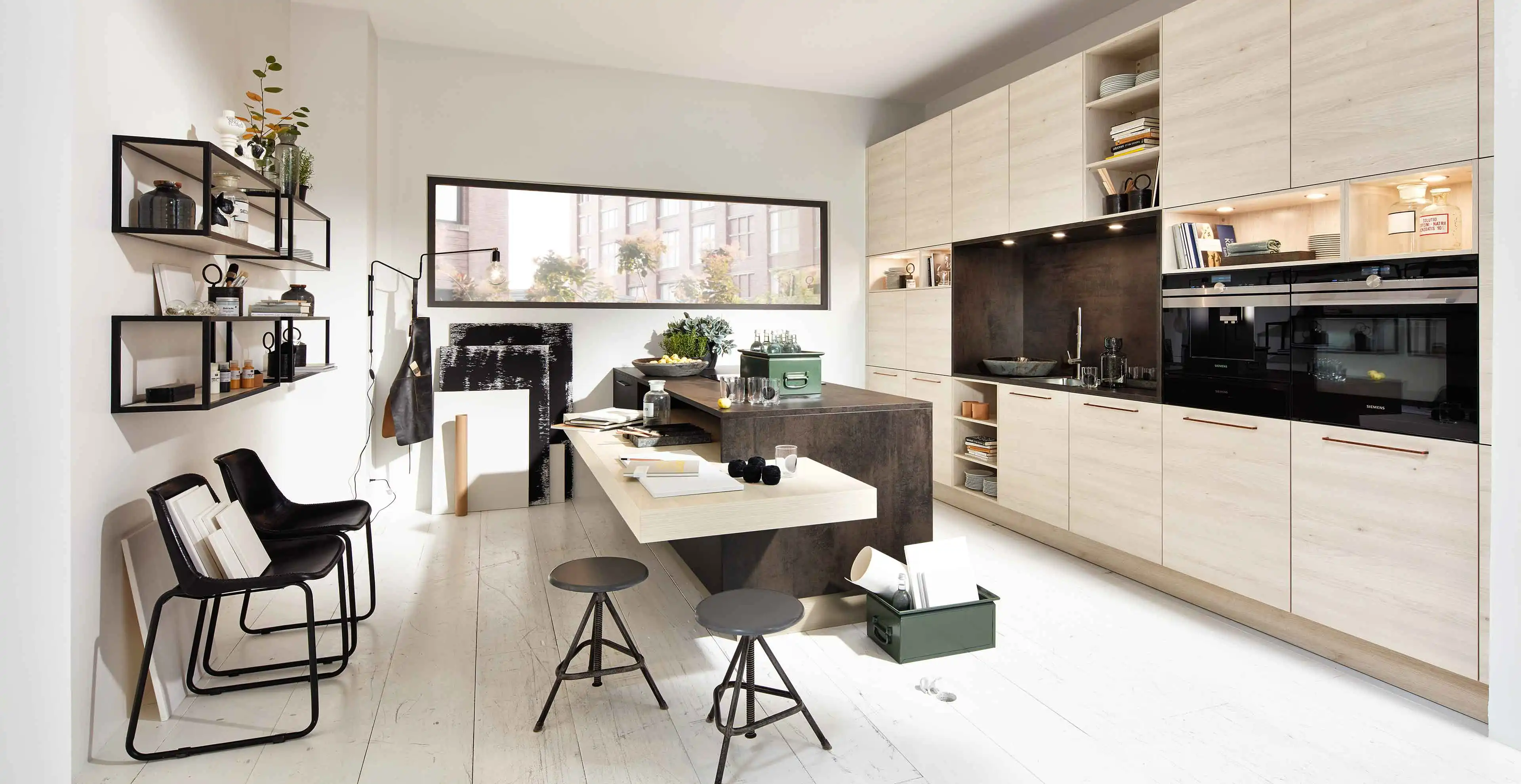 Diese Küche setzt besondere Akzente und ist dennoch klassisch gehalten. Die Kombination der matten Fronten aus Kunststoff in heller Kiruna Birke und dunkler Mooreiche wirken schlicht und geben der Küche einen aufgeschlossenen Charakter. Die oxidierten Griffe sind ein echter Hingucker.