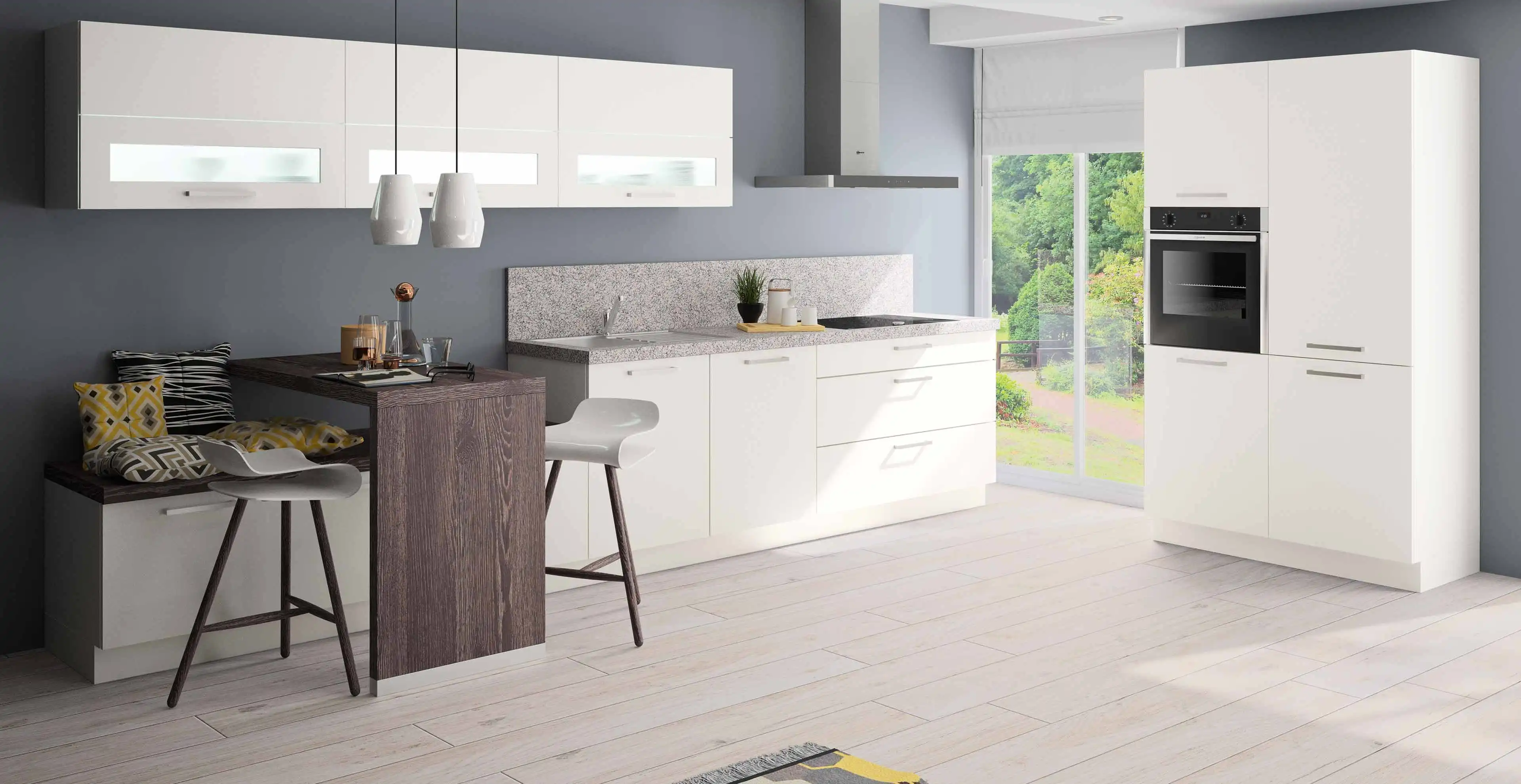Die Besonderheit dieser klassischen 2-Zeilenküche sind die klaren Linien und zudem das zeitlose Design. Durch die raffinierte Anordnung wirkt die Küche wohnlich und gemütlich.