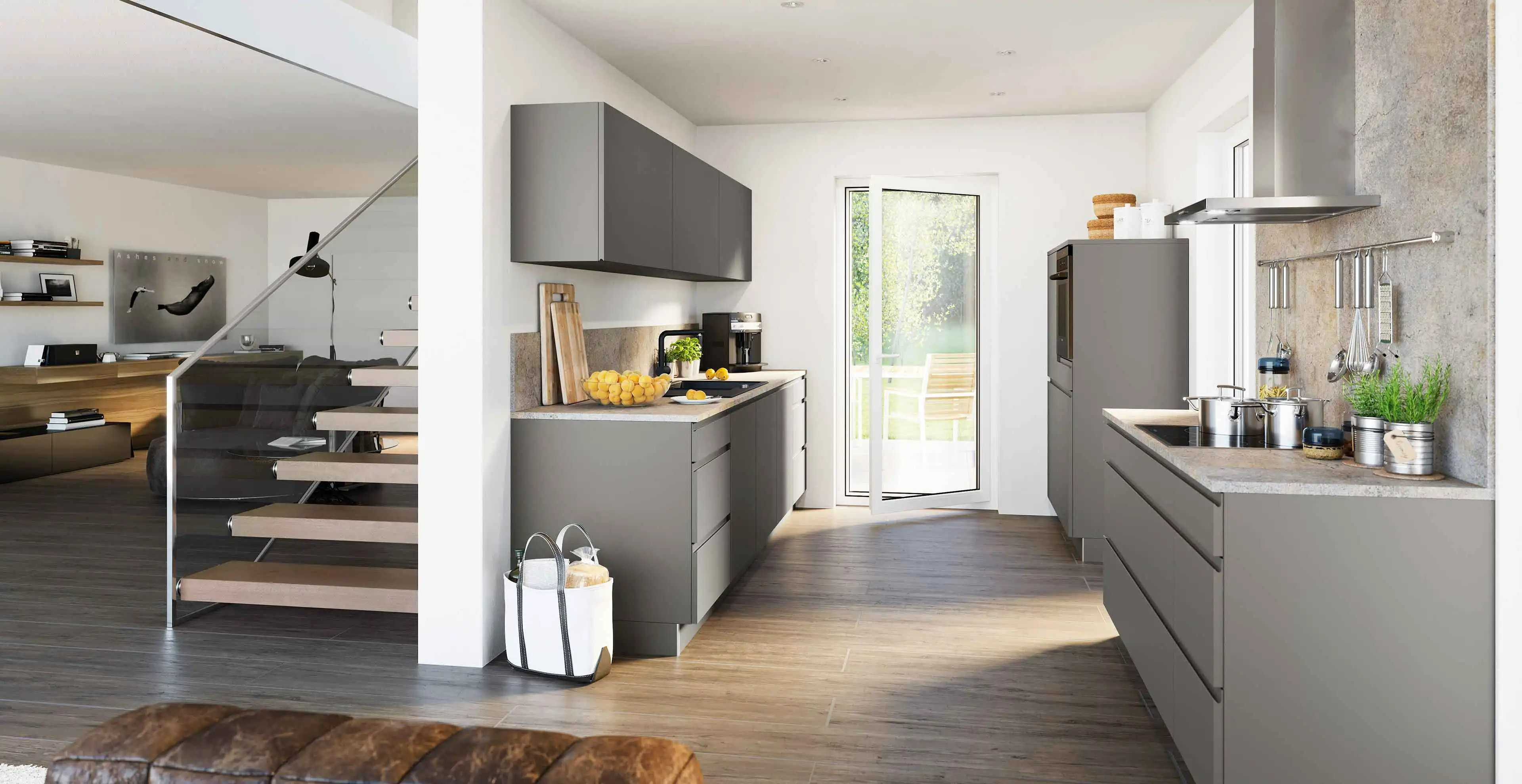 Die matten Fronten in Quarzgrau können perfekt mit der robusten Granit-Arbeitsplatte Shivakashi kombiniert werden. Große Auszüge mit grifflosen Fronten schaffen viel Stauraum in dieser Küche und sorgen für einen modernen und doch zeitlosen Look.
