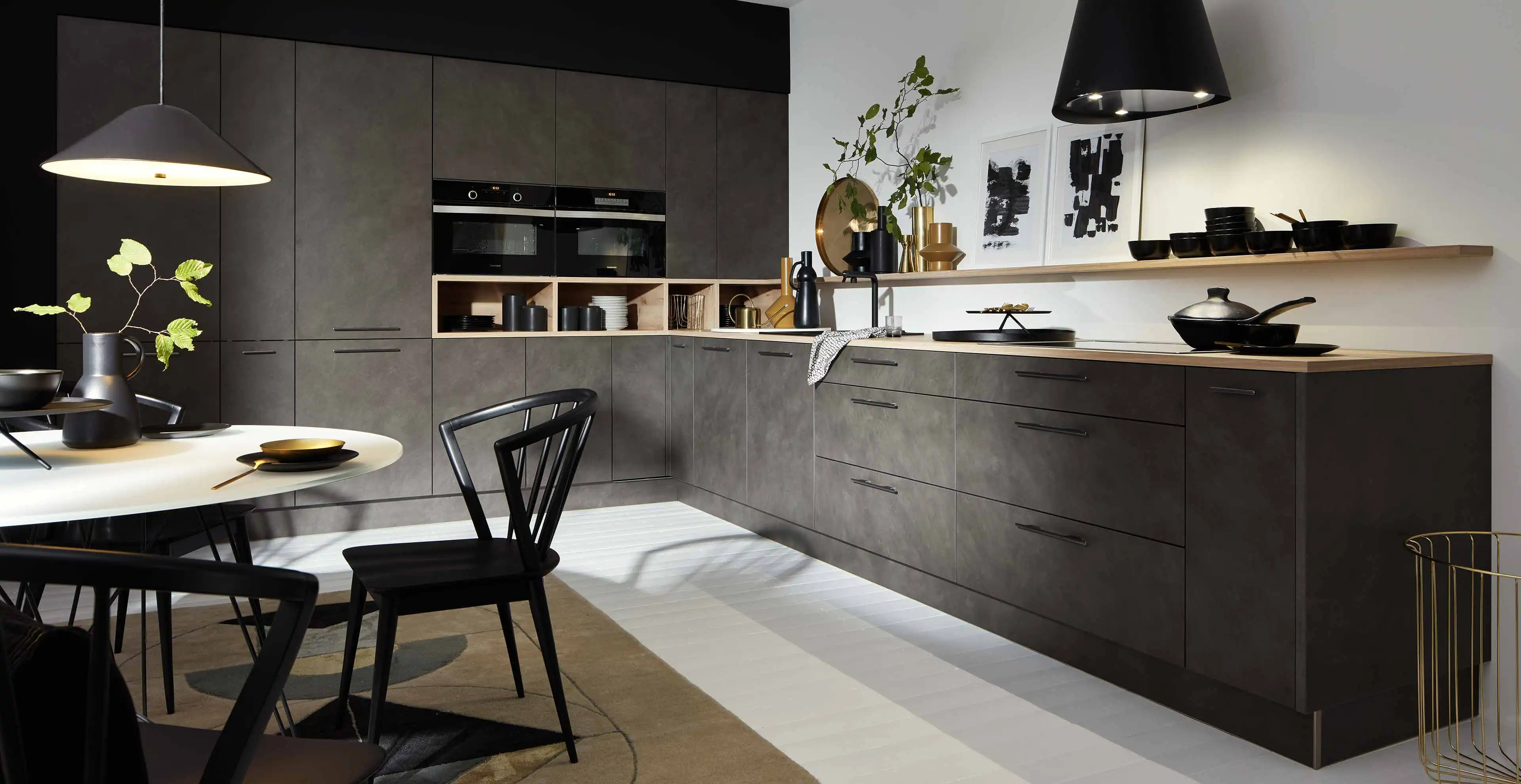Diese zeitlose Küche besticht mit klaren Linien und einer durchdachten Farbgebung. Die sorgfältig ausgewählten Details in moderner Holzoptik sorgen für ein wohnliches Ambiente und laden die ganze Familie zum Kochen ein.