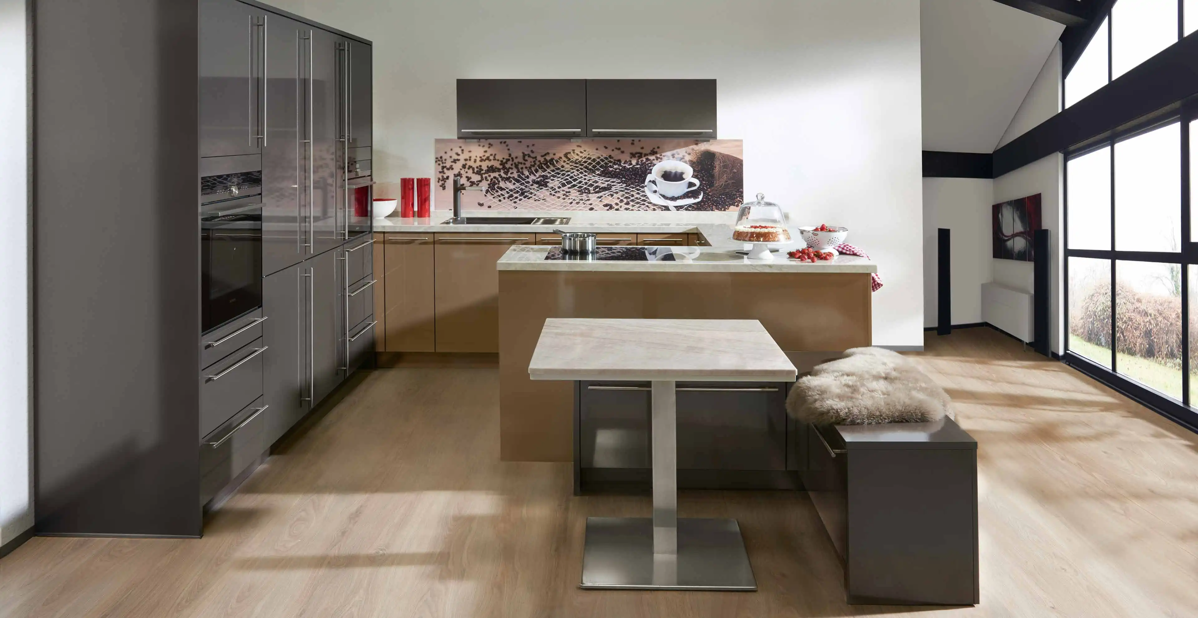 Bei dieser klassischen Küche von Marquardt Küchen wird die U-Form so in Szene gesetzt, dass dabei ein einmaliges Küchenensemble erzeugt wird. Der Küchenschrank mit glänzenden braunen Lack-Tönen liefert umfangreichen Stauraum und steht in einem optischen Kontrast zu den Goldtönen der Unterschränke.