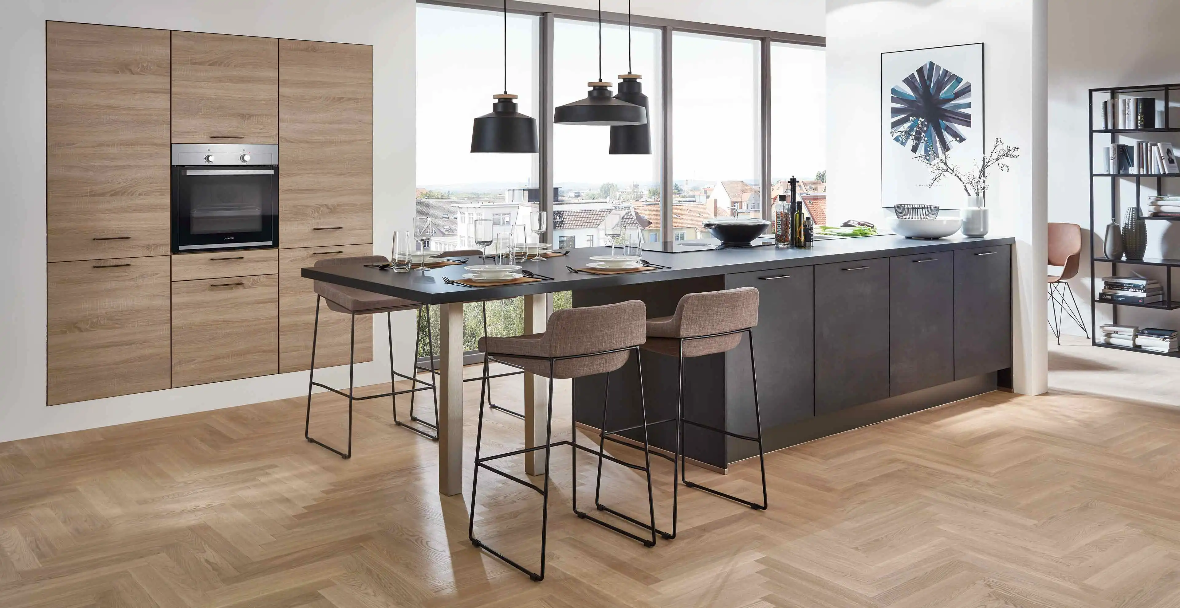 Die Küche im dunklen Farbton Schwarzbeton überzeugt durch klare Linienführung, modernes Design und edle Materialien. Die besondere Optik verleiht der Küche eine schöne Struktur und Kontrast.