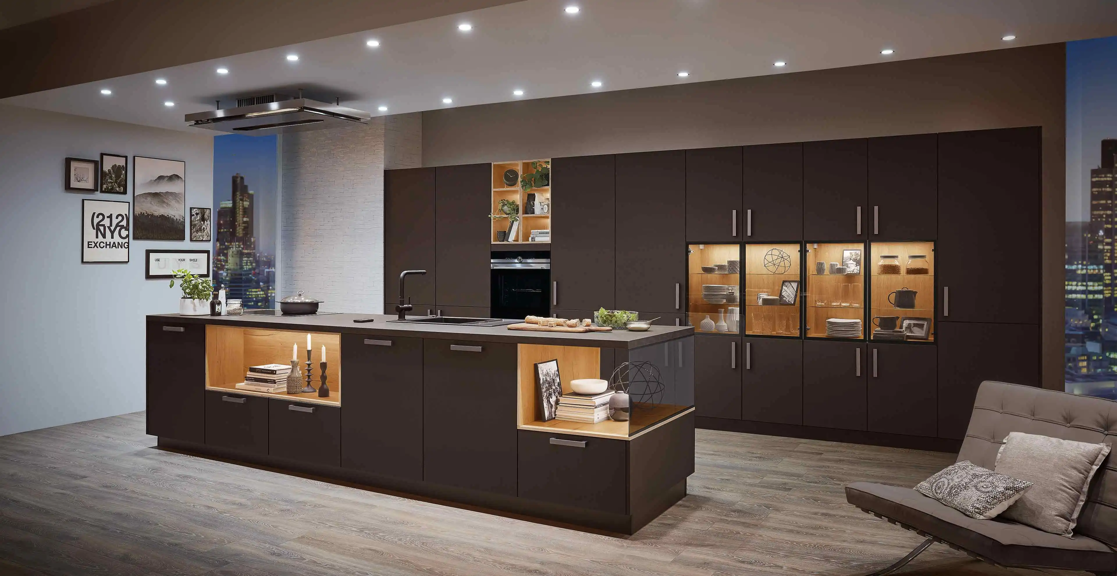 Diese Küche bietet Ihnen alles was Sie für den täglichen Gebrauch benötigen. Die geräumigen Hochschränke sorgen dafür, dass alle Ihre Küchenutensilien einen Platz haben. Zudem ermöglicht Ihnen die stattliche Kücheninsel eine komfortable Arbeitsfläche, für die Zubereitung Ihrer Speisen. Besonders praktisch sind hierbei die individuell einstellbare Inselhaube und ein großes Kochfeld.