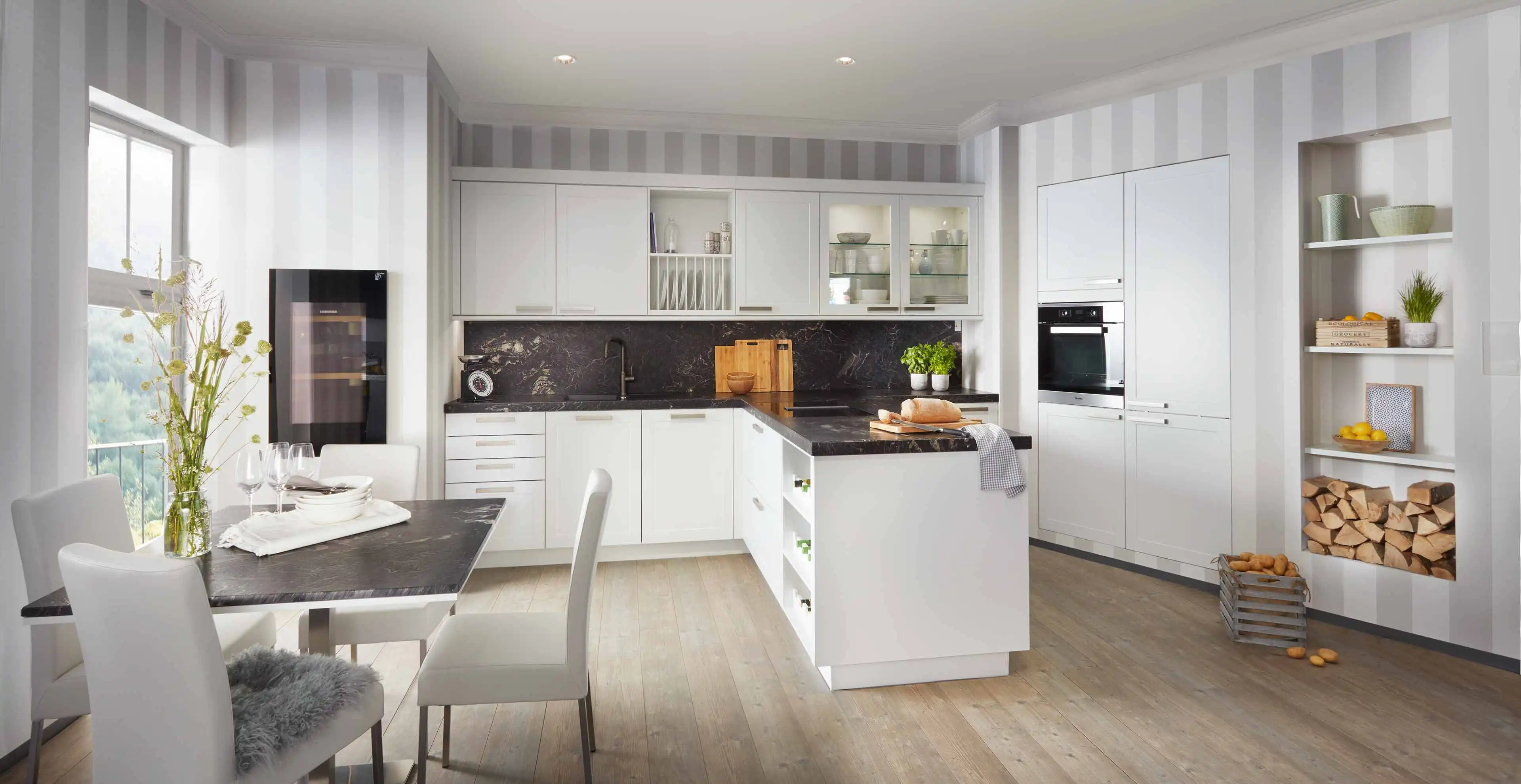 Landhausküchen sind heutzutage weit entfernt von dem ursprünglich rustikalen Flair, wie es vor einigen Jahren war. Die Küche vereint beste Materialien mit einer modernen Optik und bietet darüber hinaus höchsten Komfort – auch in der Ausstattung der Elektrogeräte. Holz, Glas und Naturstein sind beliebte Materialien, die bei einer Küche im Landhausstil Einzug finden, wie auch in unserer Landhausküche mit einer einzigartigen Naturstein-Arbeitsplatte zu sehen ist. Im Fokus stehen dabei die Qualität bzw. Wertigkeit mit einem unaufgeregten Erscheinungsbild.