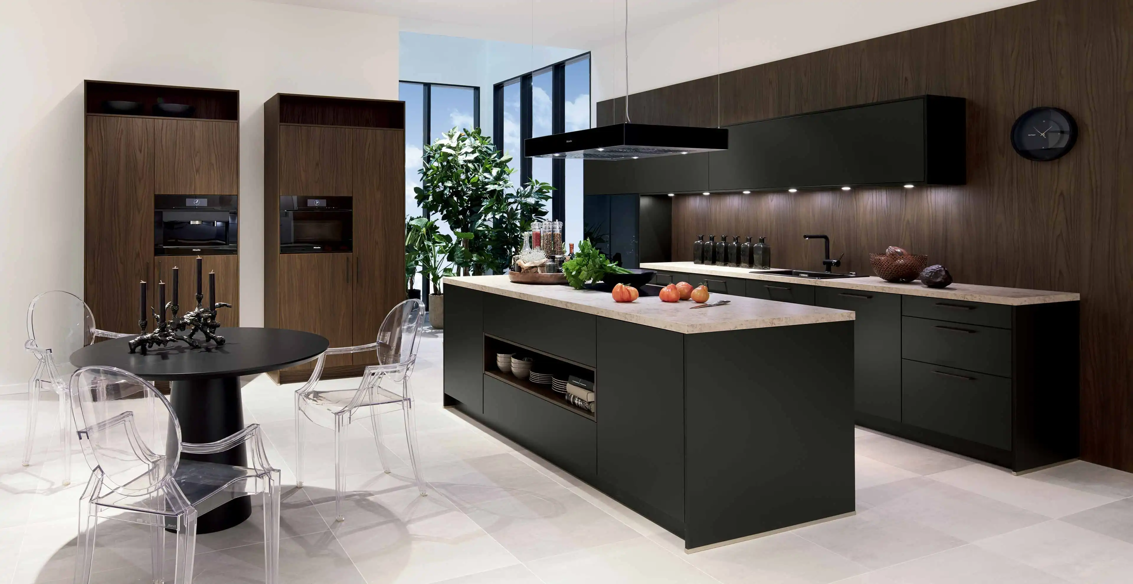 Die dunkle Holzfront lässt sich vielseitig kombinieren mit anderen Farben. Im Zusammenspiel mit der 3 cm starken Granitarbeitsplatte der Sorte Shivakashi mit edelpolierter Oberfläche verleiht der Küche einen perfekten Gesamteindruck. Die freigestellten Hochschränke mit integrierten hochgebauten Backöfen zeigen perfekte Ergonomie und Vielseitigkeit in Ihrer Küche. Die LED-Beleuchtung in den grifflosen Hängeschränken wird zu einem kleinen Blickfang. Das integrierte Schubkastensystem pro Tech Titan vereint Ästhetik mit Nützlichkeit und lässt so keine Unordnung mehr zu.