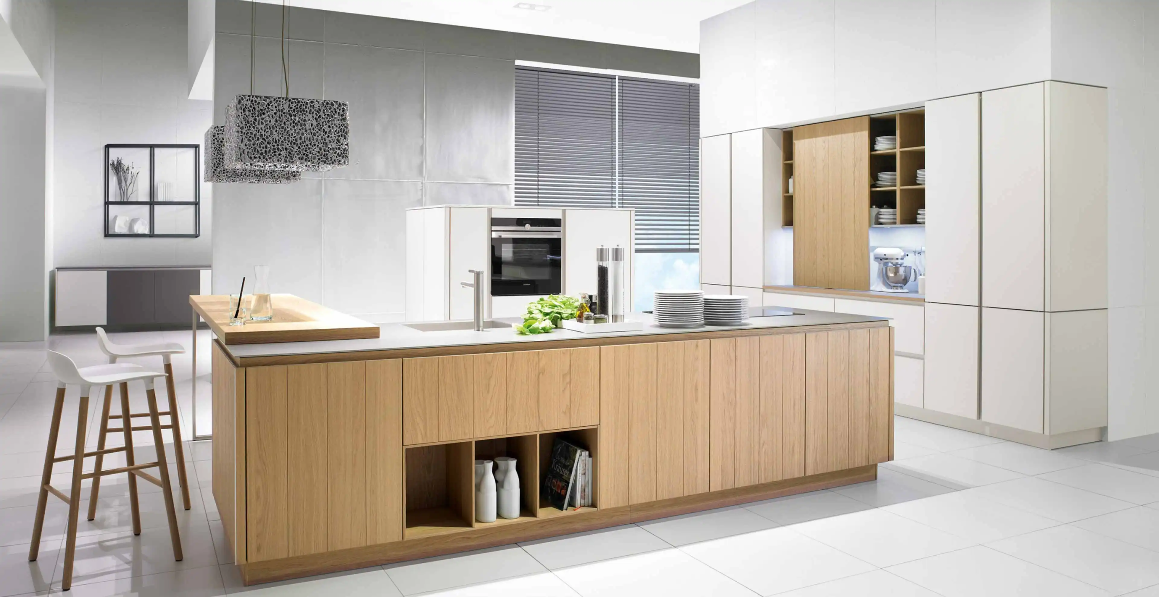 Mit dieser modernen Küche holen Sie sich ein Stück Natur in Ihr Zuhause. Das besondere Highlight in der Küchengestaltung ist die große Kücheninsel mit Küchenfronten in zeitloser Eiche Holzoptik.