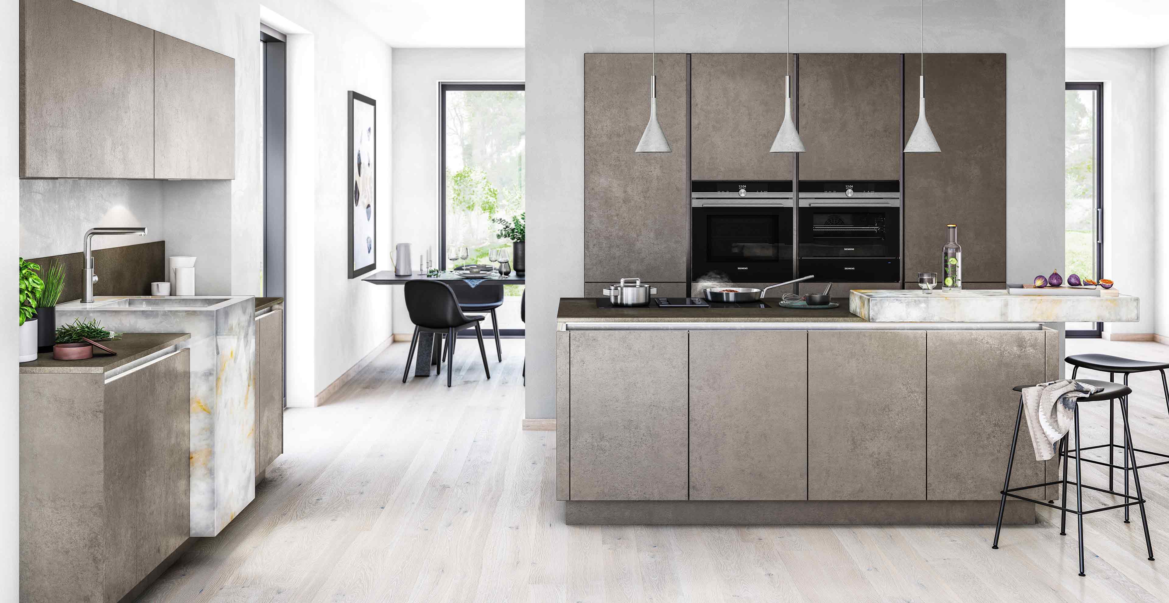 Materialmix der besonderen Art: Die matten Spachtelbeton-Fronten harmonieren farblich ideal mit der bräunlichen Keramik-Arbeitsplatte Avenue Amber. Als Blickfang kommen die innovativen Granit-Neuheiten von Marquardt Küchen zum Einsatz. Die massive Spülensäule und die aufgesetzte Theke aus hinterleuchtetem Granit bringen Ihre Küche zum Leuchten und verleihen eine angenehme Wohnatmosphäre. Steuern Sie ganz bequem mit Hilfe einer Fernbedienung die integrierte LED-Beleuchtung in verschiedenen Lichtstärken und verändern Sie die Leuchtkraft der Steine je nach Anlass - Ihre Gäste werden Augen machen!