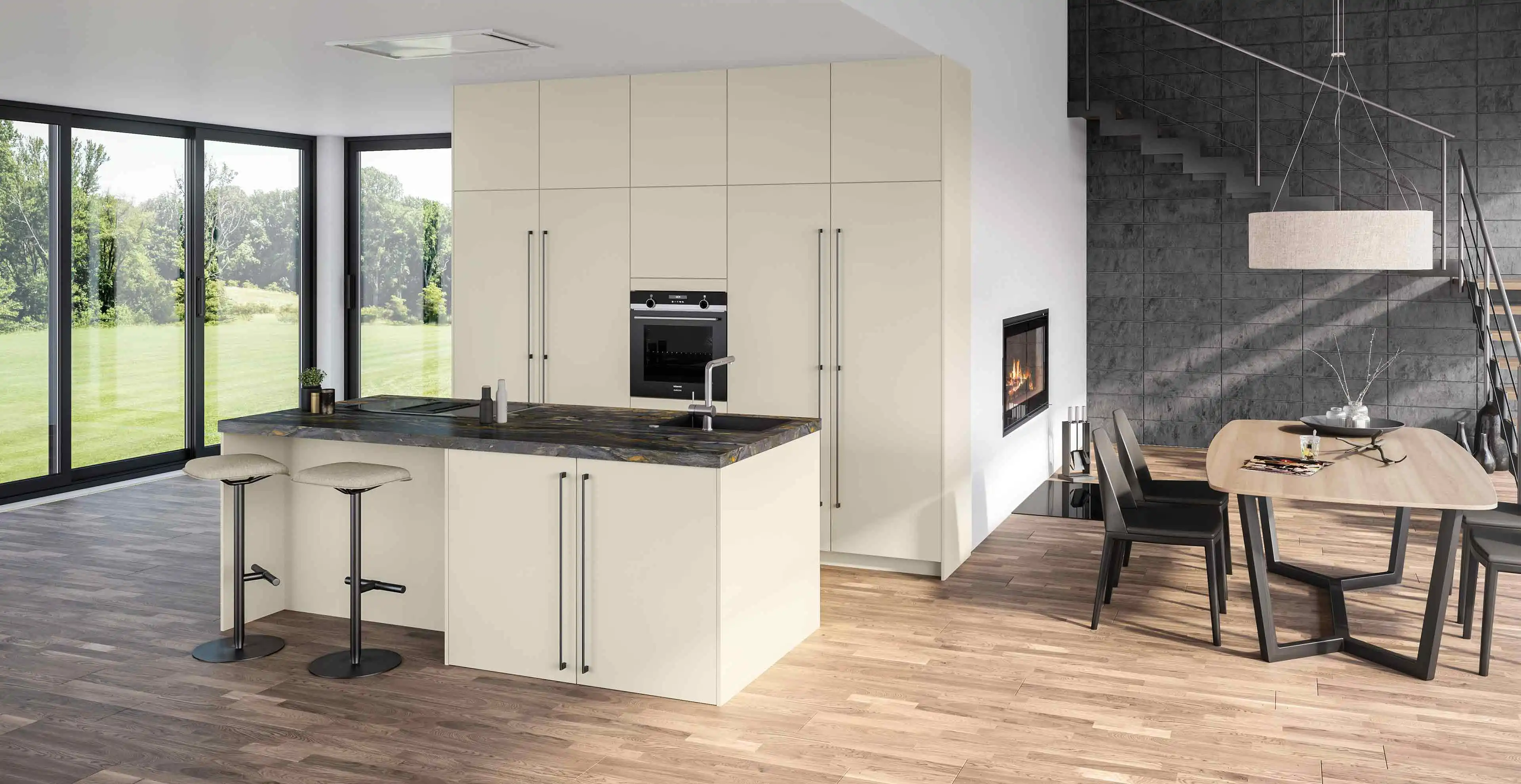 Mit einer offenen Wohnküche verbinden Sie Kochen, Kommunikation und Wohnen. Sichern Sie sich diese moderne Inselküche inklusive edler Naturstein-Arbeitsplatte Blue Santorini, die durch ihre prächtigen Farben zum absoluten Highlight in Ihrer Küche wird. In Kombination mit besten Markengeräten sowie zeitlosen Fronten wird neben der Optik auch beste Ausstattung untergebracht.